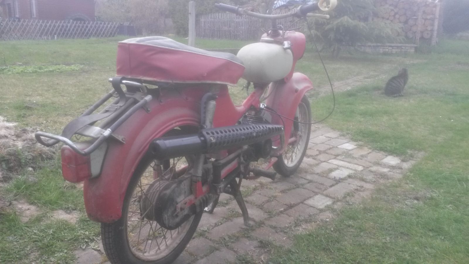 negativ: Fußraste links abgebrochen, Motor fest, Auspuff durch, gammeliger Schonbezug, Kette unbrauchbar, wahrscheinlich noch die ersten Reifen.
