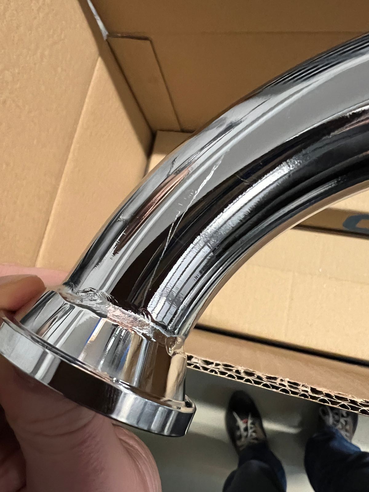 Zum Krümmer selbst. Der Kratzer bei dem Kalottenkrümmer, ist ärgerlich, dürfte nicht sein. Dazu aber: es wurde so fotografiert, dass es wie ne Riesenkratzer aussieht. Ist es aber so gering, wenn jemand einfach im Hand nimmt und vom 50cm anschaut, nicht mal auffällt. In der Retourenabteilung musste der Kollege erst mal nachfragen, dass wir bitte in dem E-Mailverkehr schauen was der Reklagrund war