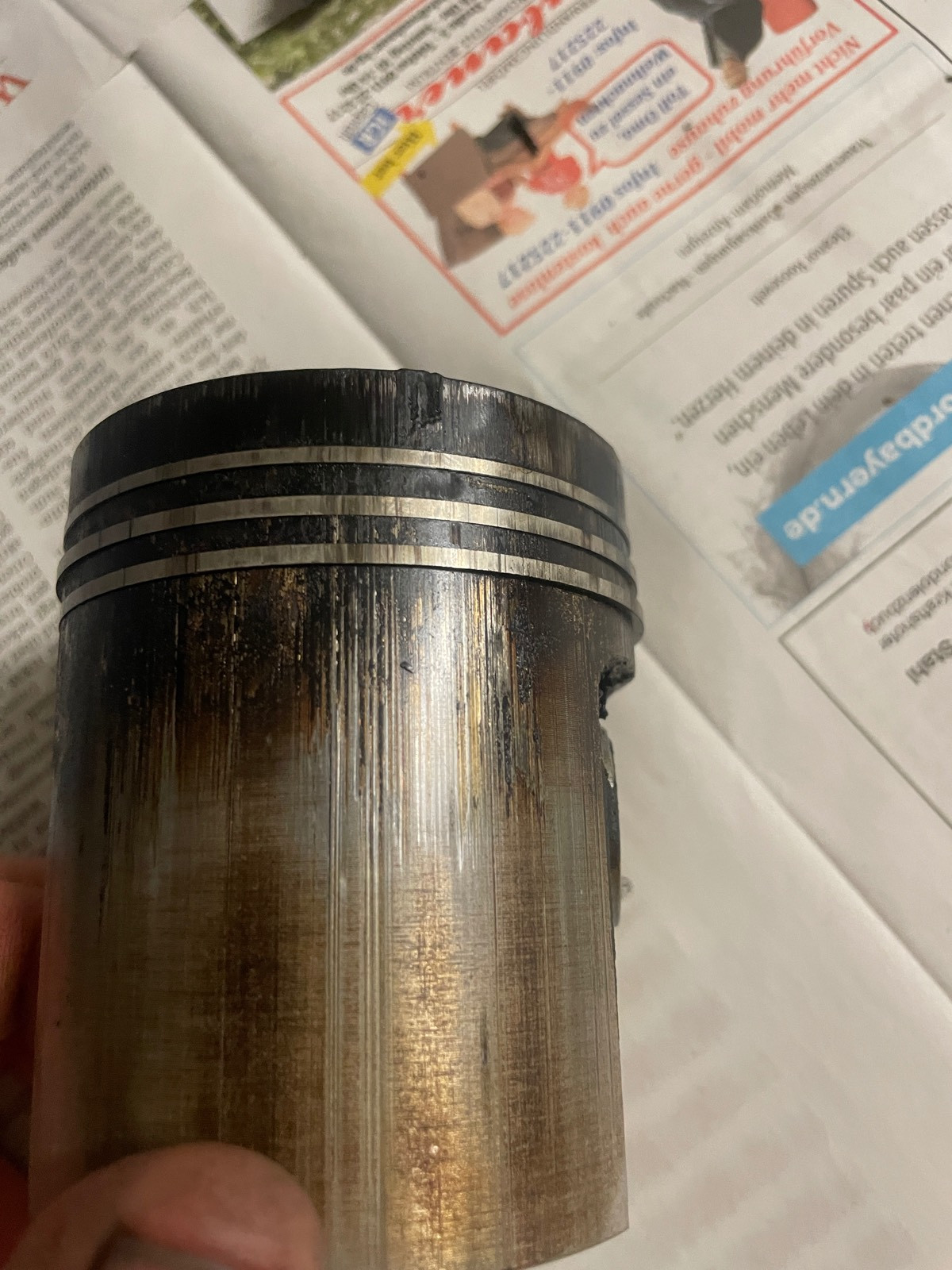 Die oberen beiden Kolbenringe sind/waren fest. Der Zylinder selber hat recht wenig abbekommen.