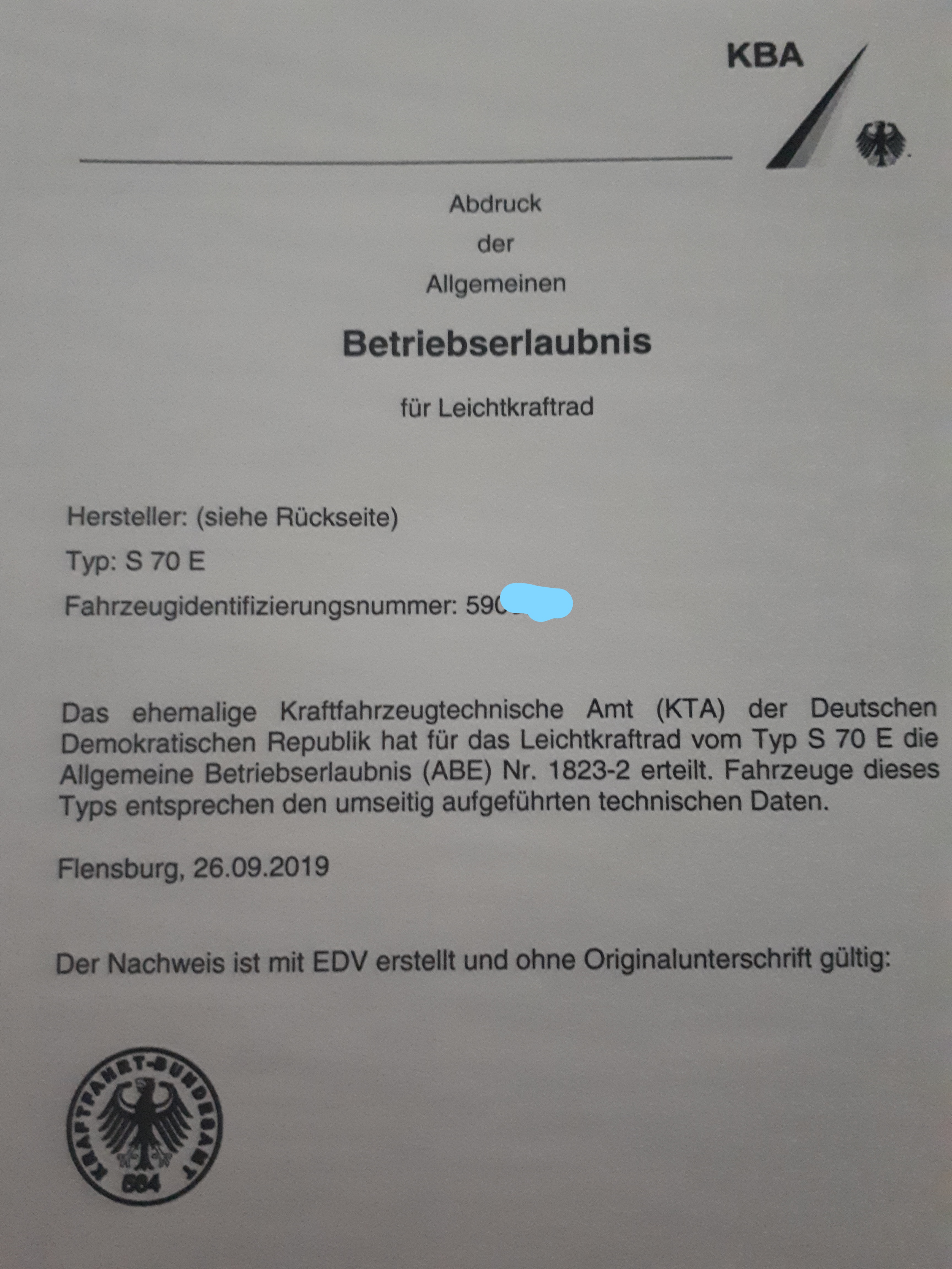 Das Moped kenne ich schon seit ca. 2000 da hat es ein bekannter in Thüringen bei einem Motorradhändler gekauft .. dann stand Sie jahrelang rum irgendwann wurde Sie mal auseinander gebaut und komplett grün lackiert nach langer weiterer Standzeit zerlegt und in einem Schrank deponiert .. und als Sie störte konnte ich Sie bekommen.... Papiere waren leider weg .. daher letztes Jahr neue Betriebserlaubnis beantragt .. siehe da alles passte original Simson S70 E
