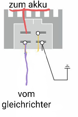 (D. h. von vorne auf den Stecker des Reglers gesehen: oben-links: Akku; oben-rechts: nix; unten-links: '+' vom Gleichrichter; unten-rechts: Masse)
