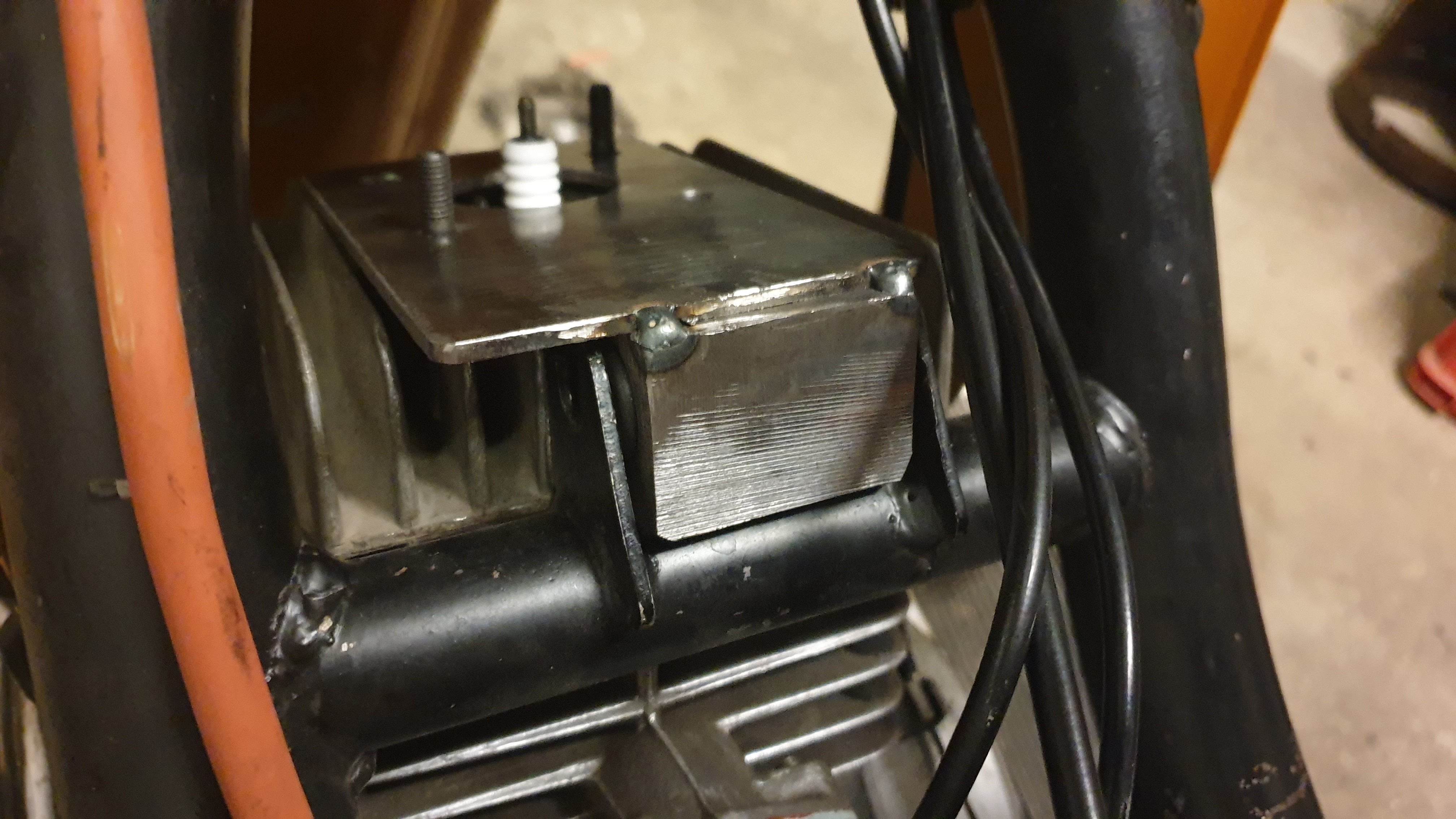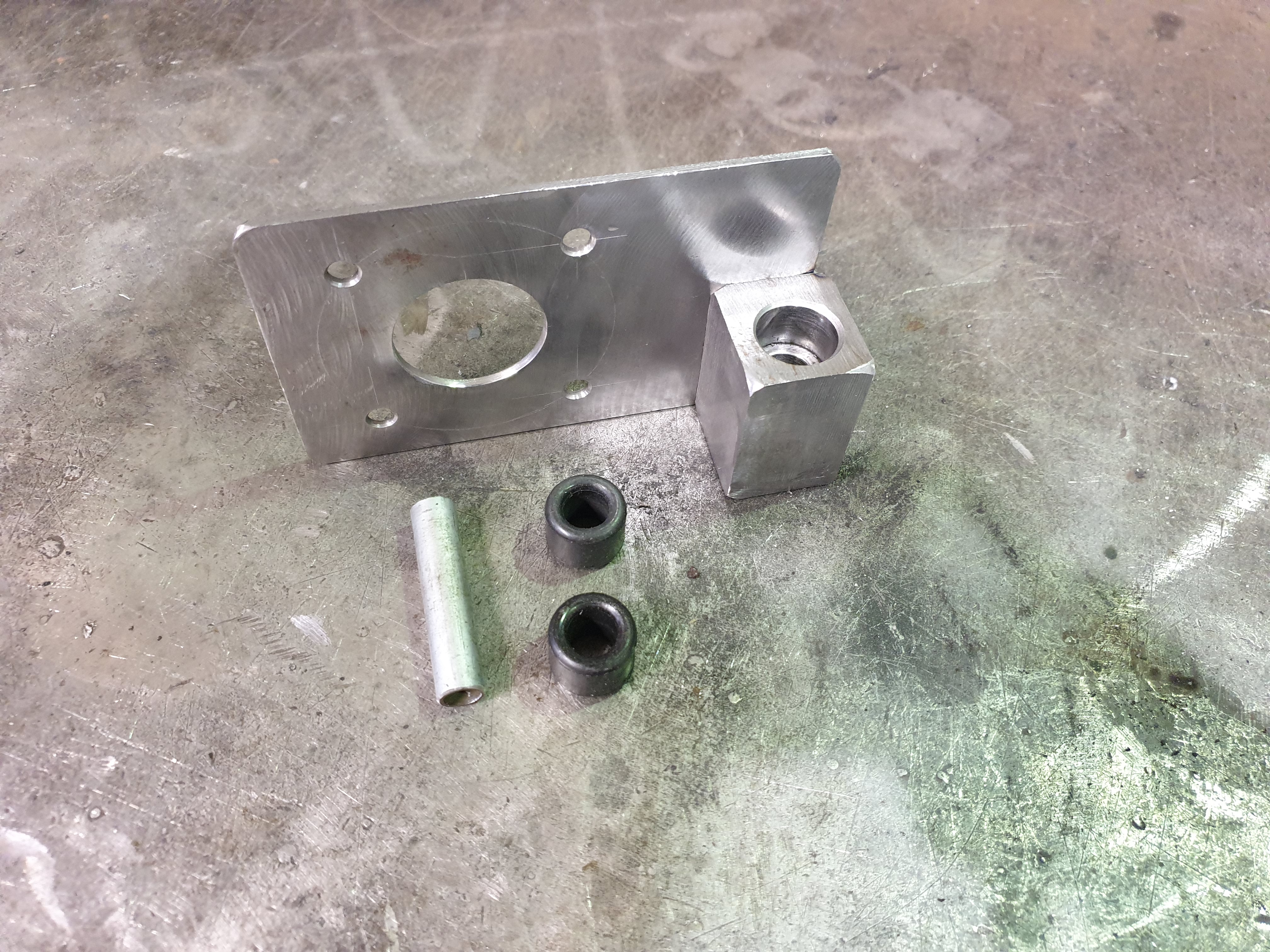 Vom fertig verbauten Teil habe ich gerade kein Foto. Funktioniert gut. Habe ein 40er Vierkant Stahl genommen. Aufgebohrt das die originalen Gummis vom 1er Motor rein passen. Das Loch ist außermittig damit die abstände alle passen. -