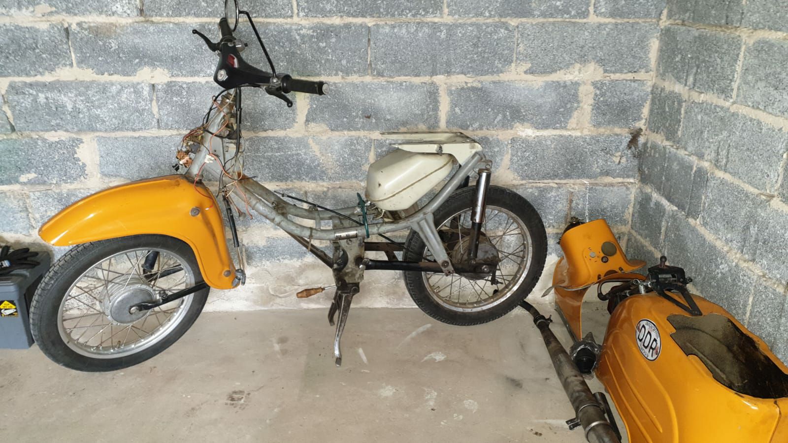 Das Blechkleid soll auf jeden fall so bleiben, man kann ruhig sehen dass das Moped gelebt hat, das macht es erst besonders, zumindestens ist das meine Meinung. Waren den die Lenkerbleche bei der Serie in Wagenfarbe? die Schwingen scheinen mal neu gekommen zu sein, jedenfalls sind die ganzen Gummiteile noch im gutem Zustand und auch keine Macken etc. dran.