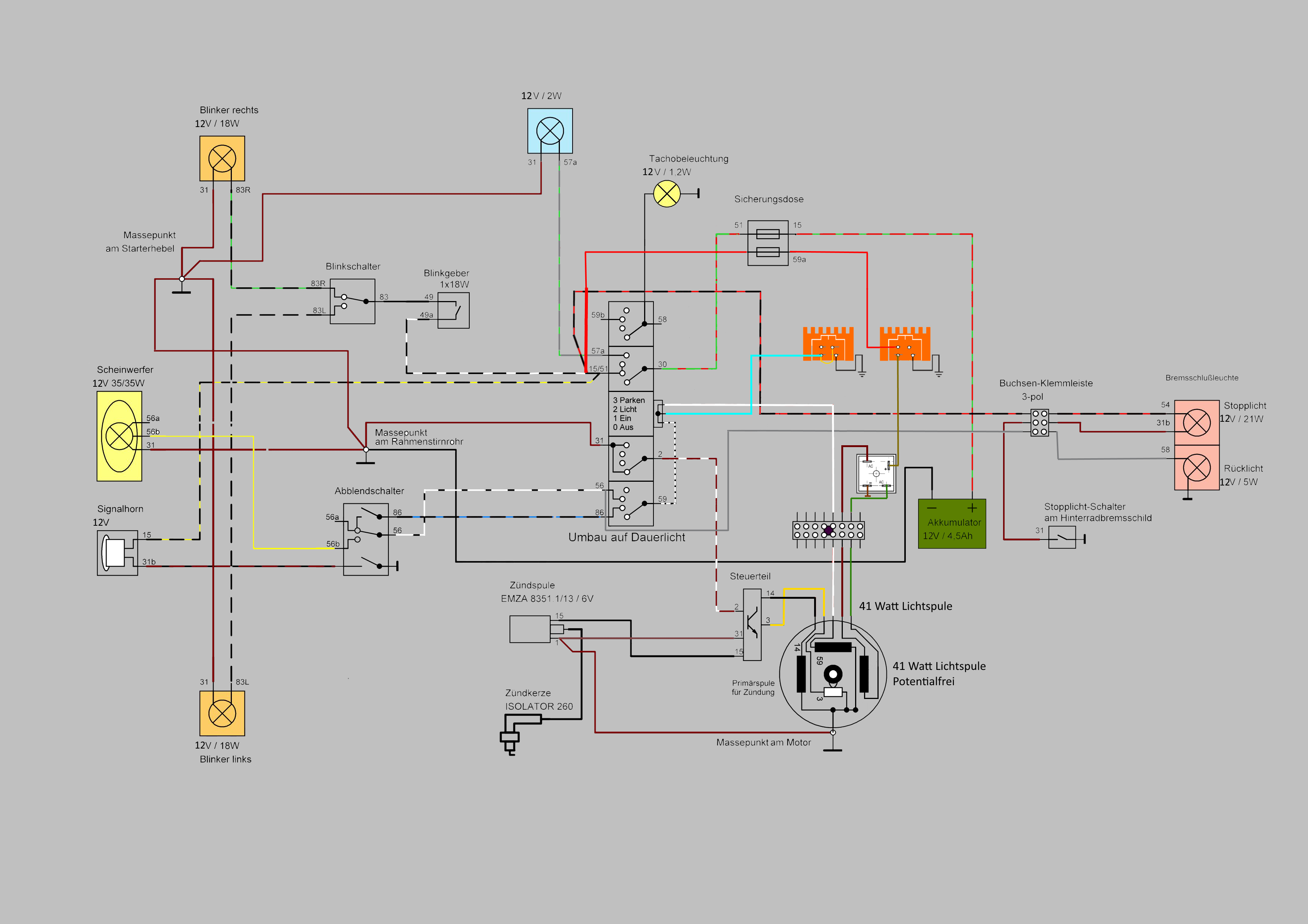 Ja richtig, habe ausversehen den zwischengespeicherten Schaltplan hier reingestellt. Ja die Tachobeleuchtung läuft auch über die Lichtspule. Bin leider in Quarantäne und werde nicht in meine Schraubergarage kommen die nächste Zeit. Ist ja zum Glück erst Januar. Ich habe noch einen HS1 Scheinwerfer bei Kleinanzeigen gefunden. Der wird dann noch verbaut.