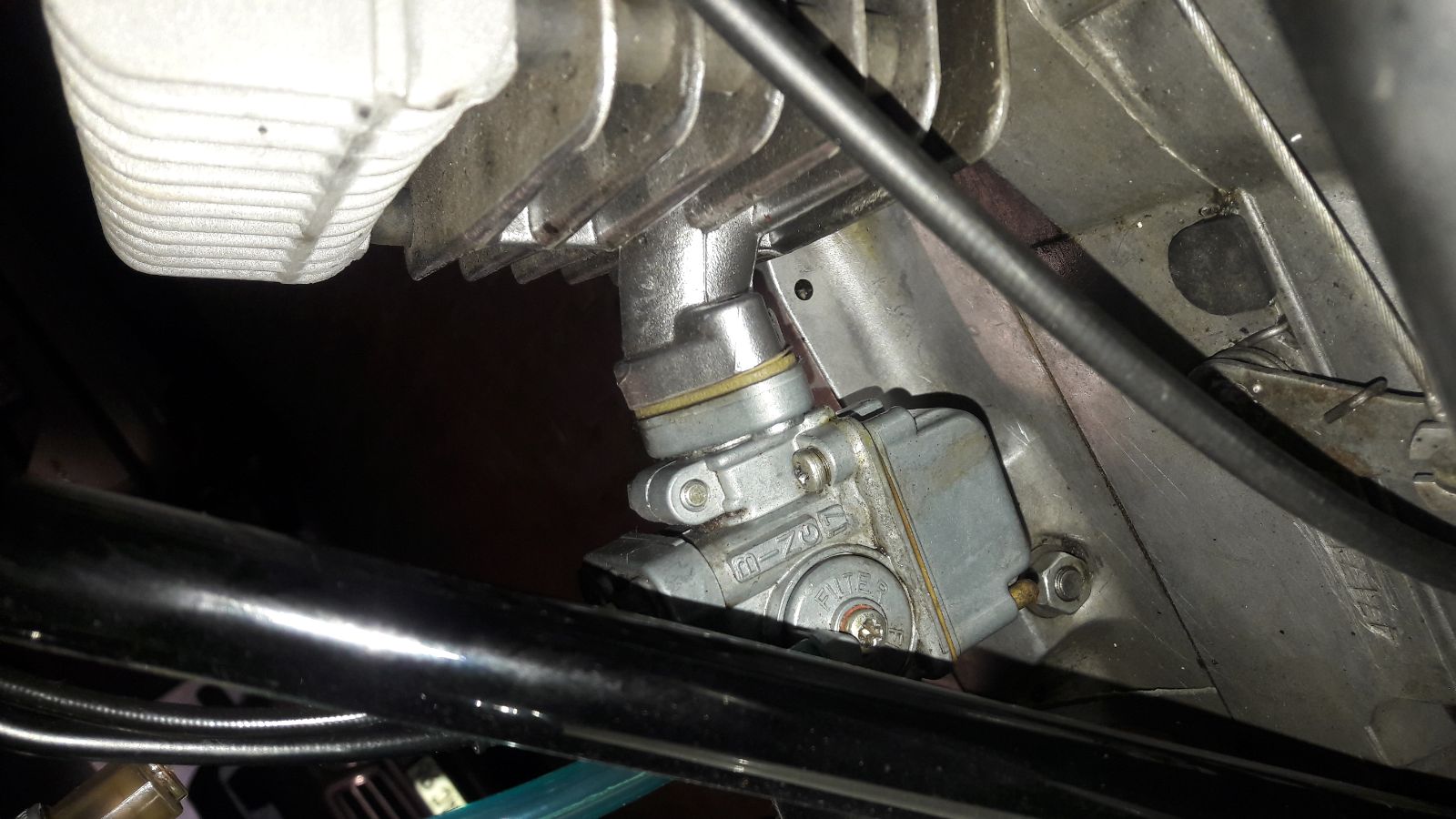 Ich hab mal nen kleinen Test gemacht (siehe erstes Foto). Ja ich weiß macht man egtl. nicht, hab aber nen Lappen zwischen Motor und Vergaser geklemmt und bin dann wieder so paar Minütchen übern Hof gefahren.