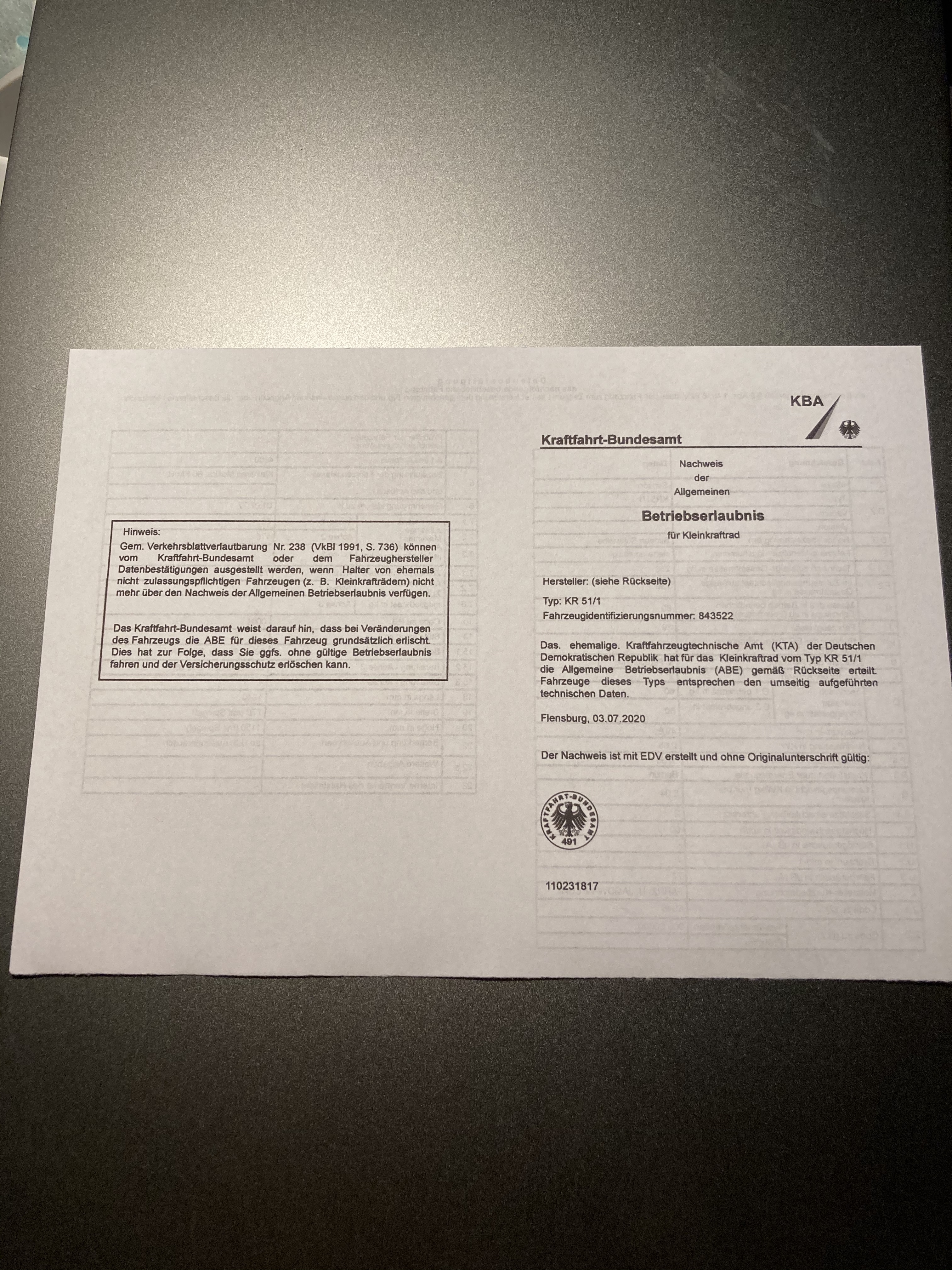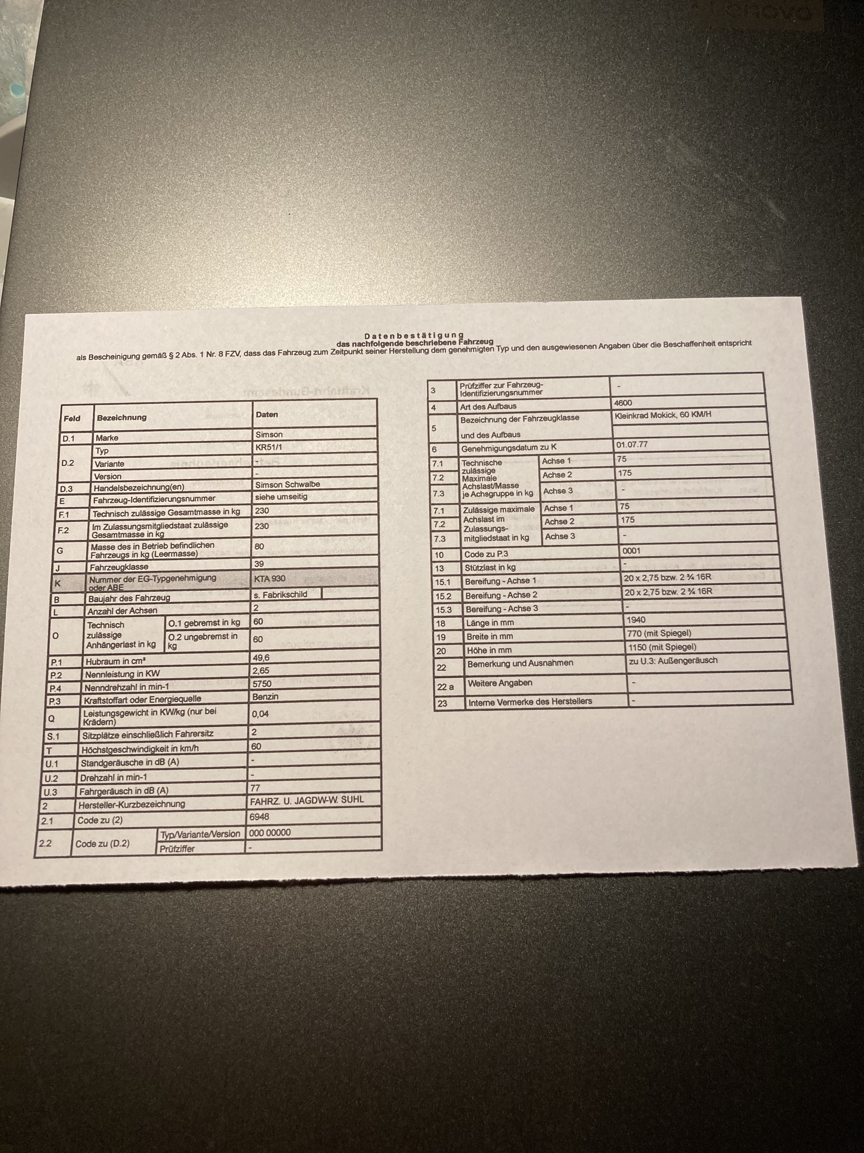 ich habe mir vor kurzem eine Schwalbe gekauft, mit KBA Papieren. Der Verkäufer wurde unruhig, als ich ihn auf die Papiere angesprochen habe, nun meine Frage an euch, fällt euch irgendwas auf?