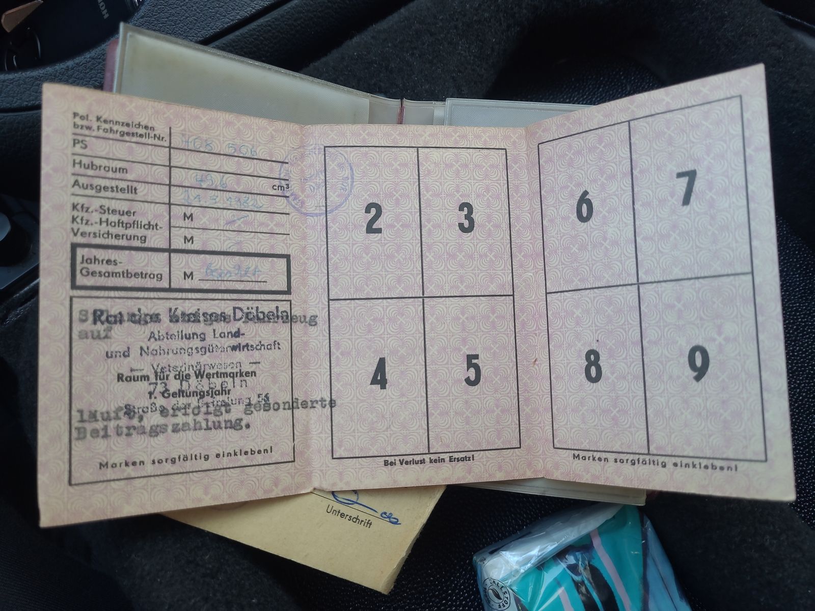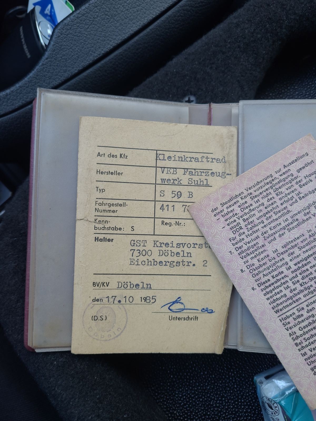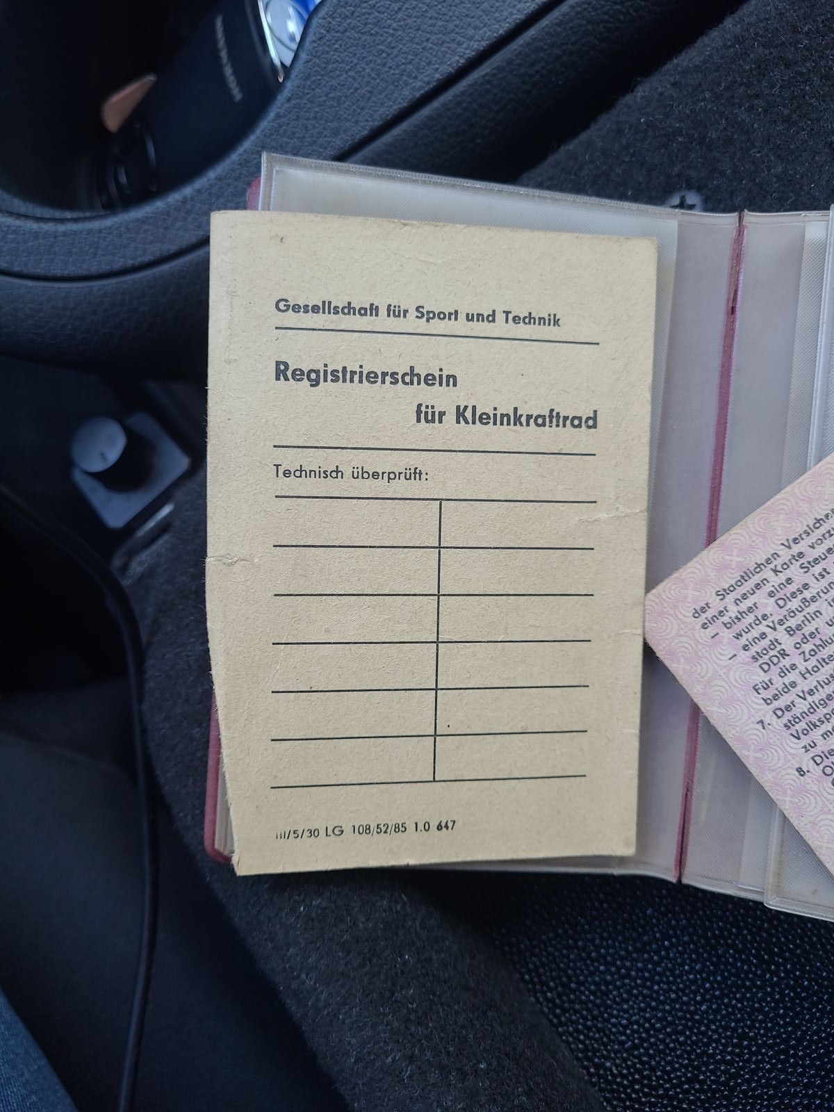 Die einzigen Papiere vom Moped sind ein Registrierschein von der Gesellschaft für Sport und Technik Döbeln. Dieser Verein/Verbund war damals eine Art Militär in der DDR.
