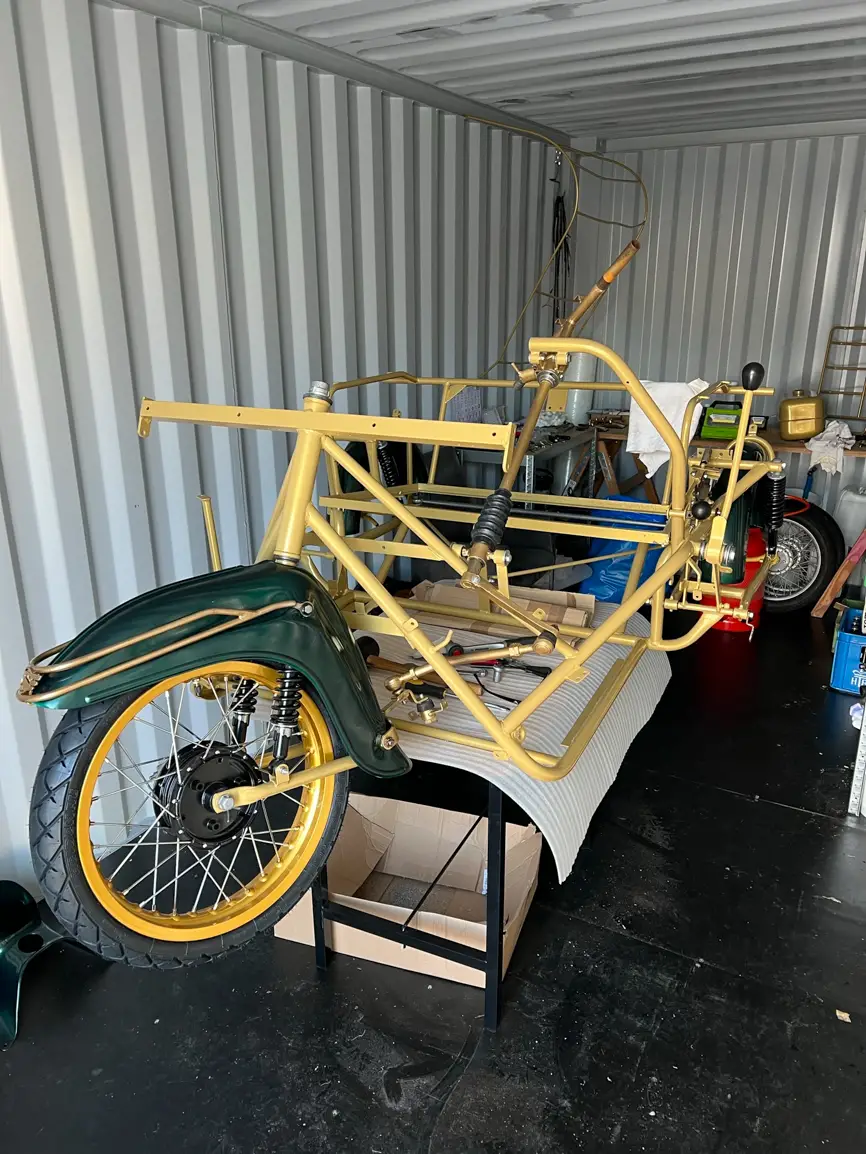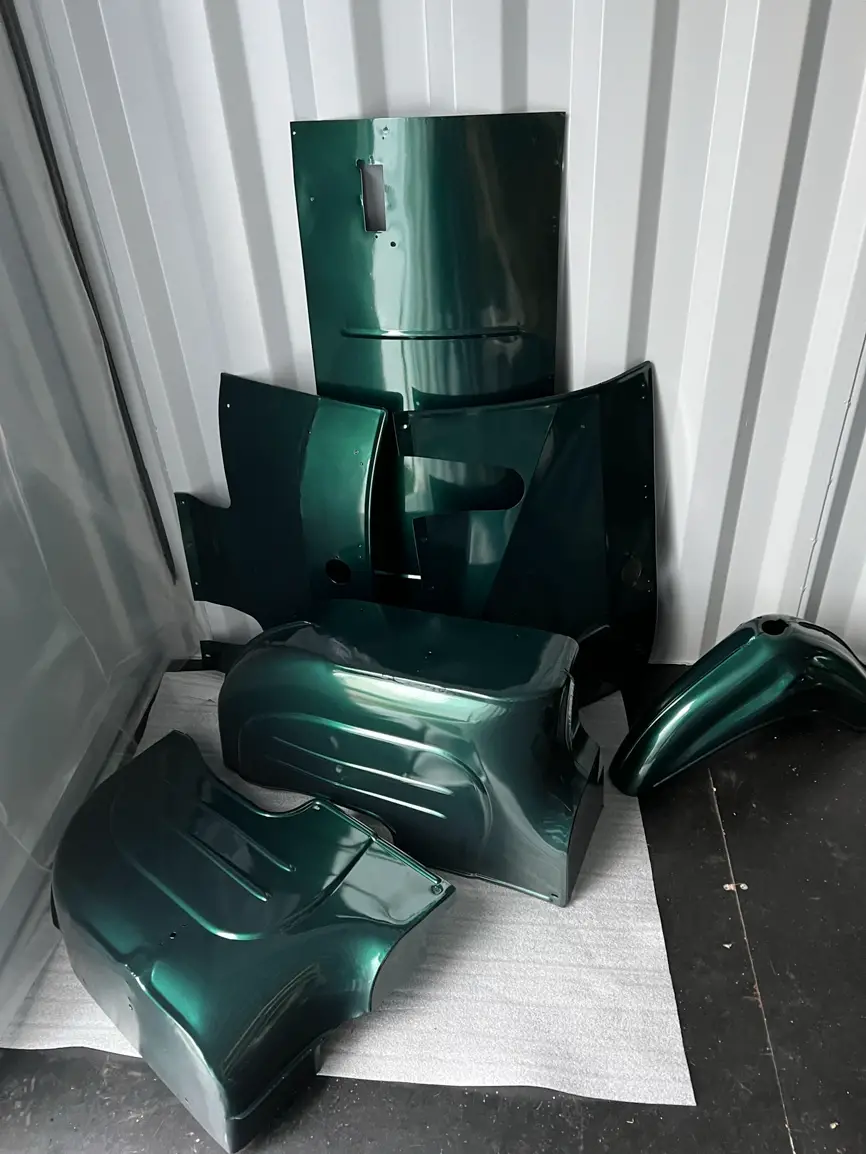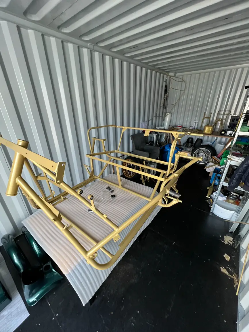 - hab das Duo jetzt angefangen runter zu bauen. Ende Oktober kommt der Rahmen zum Sandstrahlen und Pulvern (Gold) und die Blechteile nur zum Sandstrahlen und Grundpulvern (lackieren tue ich die Blechteile selbst ) in metallic-grün. Ich will hat was exklusives und poppiges