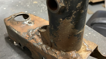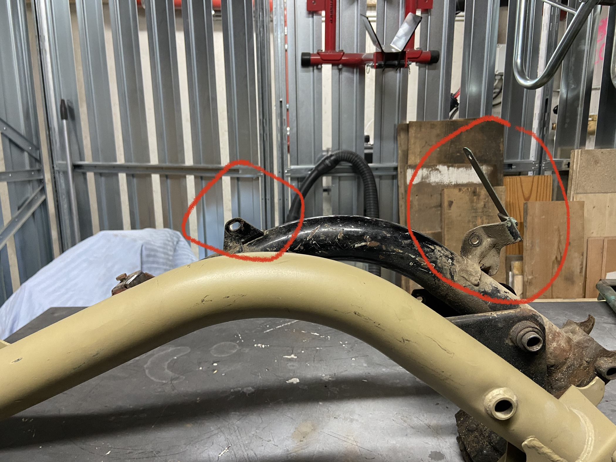 mittlerweile habe ich mich entschieden, mit dem Rahmen/Fahrwerk anzufangen. Jetzt habe ich folgendes Problem, an dem Rahmen mit der besten Grundsubstanz fehlen zwei Haltebleche (Siehe Foto). Hab schon mein Glück in der Suche und in den gängigen Onlineshops versucht. Bin aber nicht fündig geworden, weil einer ob und wenn ja das wo, man die nachkaufen kann? Anschweißen könnte ich sie selbst (WIG für minimalen Hitzeeintrag).