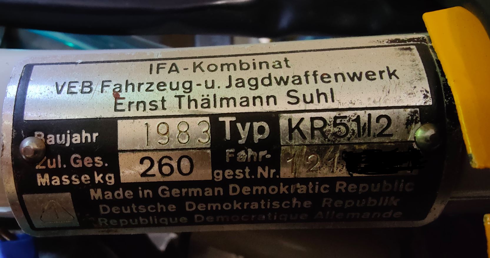 Ich hatte letztes Jahr eine ziemlich fertige KR51/2, BJ 1983, mit original DDR-Betriebserlaubnis und Typenschild gekauft. Also habe beim Erwerb schon darauf geachtet das alles "legitim" ist. Da ich die original Papiere hatte, habe ich das Ding restauriert ohne vorher detailierte Fotos zu machen. Sprich: Zerlegt, Typenschild ab, alte Kerbnägel weg, Rahmen sandgestrahlt, lackiert, neue Kerbnägel, altes Typenschild. Wie es der Zufall der Zeit will - Papiere irgendwann weg.