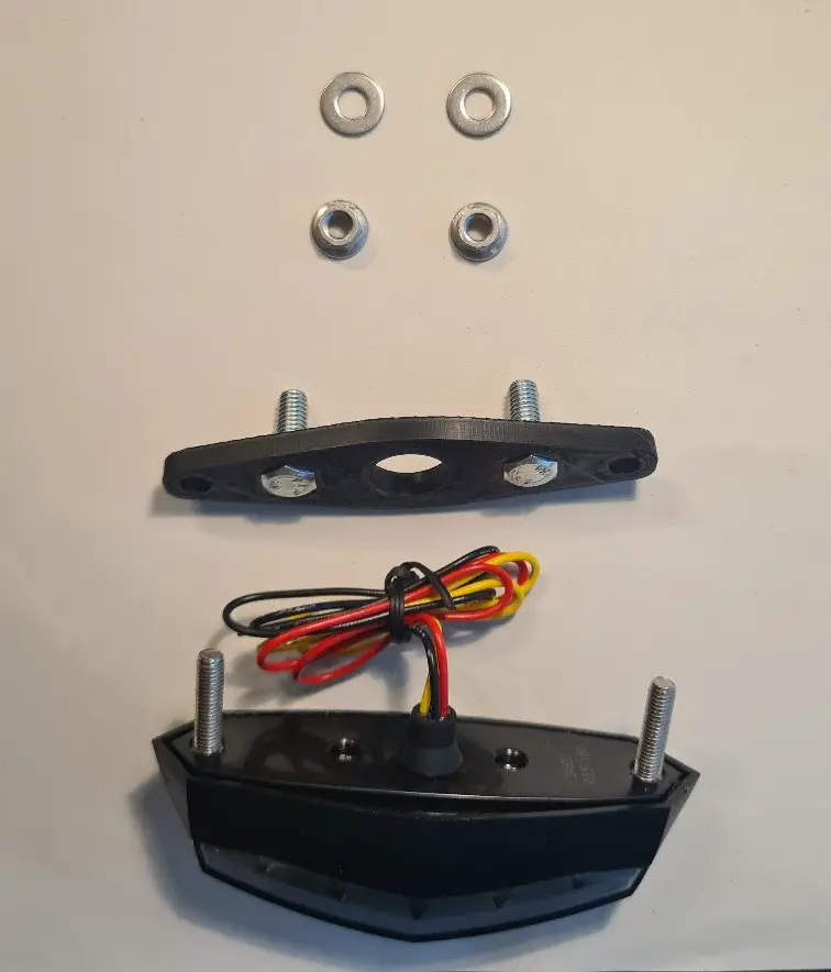 Auf den Bildern ist die v1, welche mit 5mm Dicke und 3mm versenkung nicht ganz Dick genug war, sodass die Schrauben leicht herausgeguckt haben, und das Rücklicht einen kleinen Spalt zwischen sich und Adapter hat.
