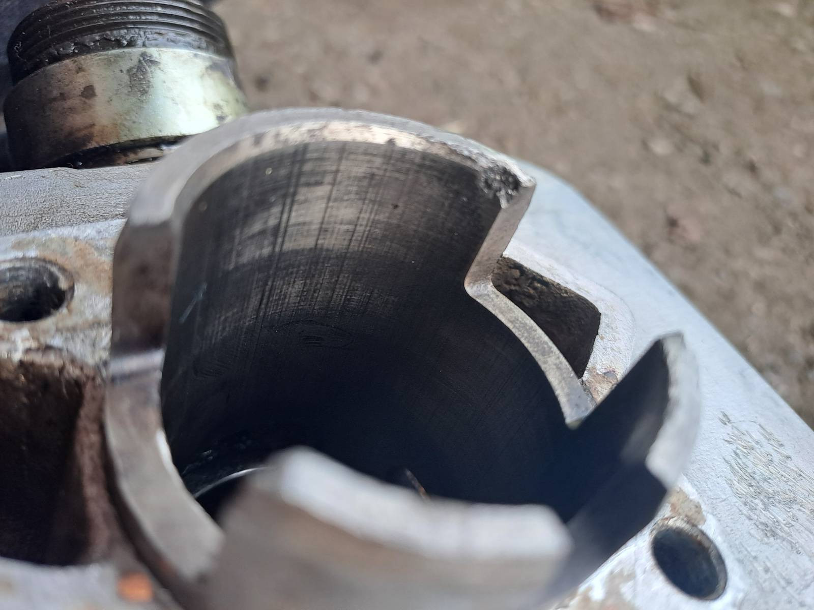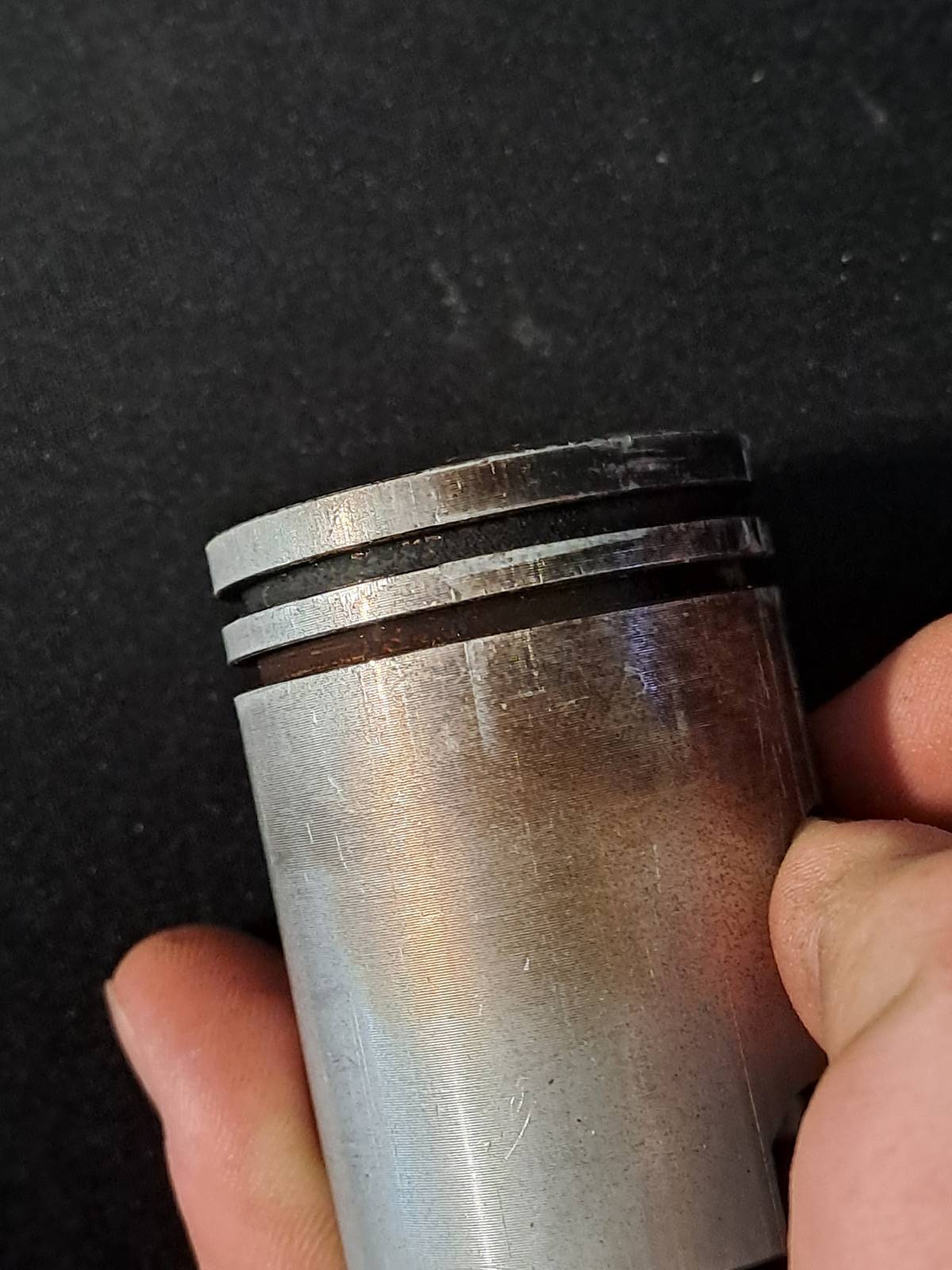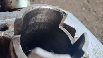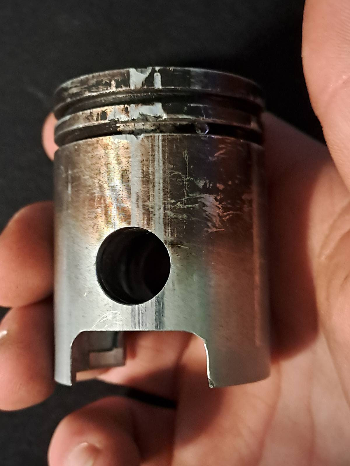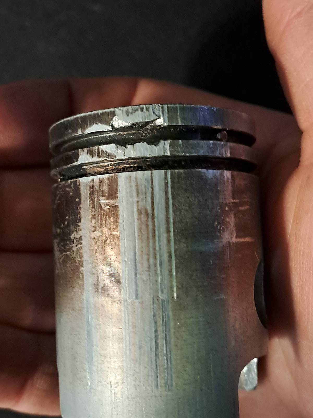 Komische Punkte oben? Da ist wohl was durch den Brennraum gewandert und auf dem Kolben eingeschlagen. Ich fürchte da besteht das Risiko das Fremdkörper / Späne auch im Kurbelgehäuse sind die im schlimmsten Fall einen Fresser verursachen können.