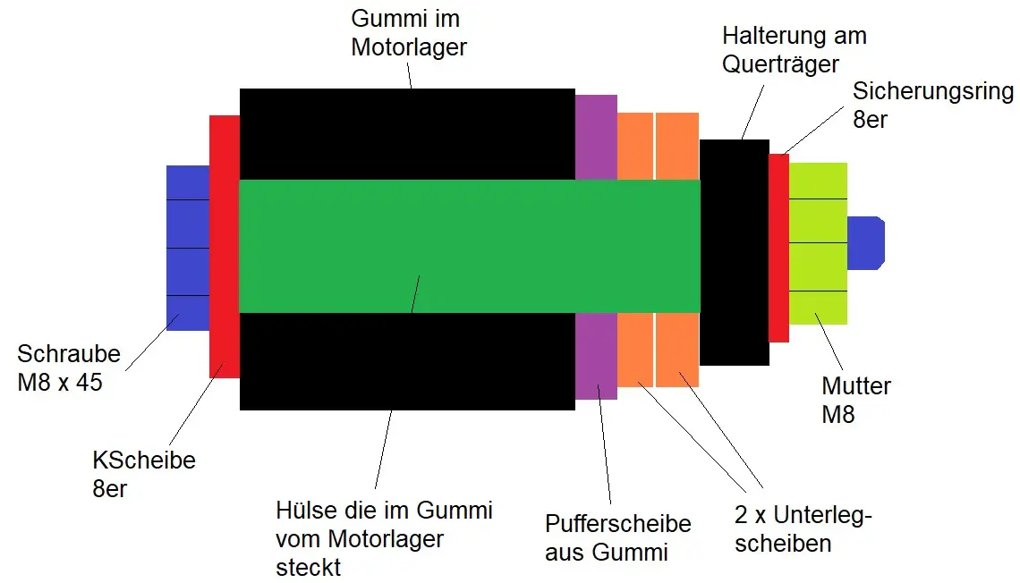 Wenn ich die Schraube und Mutter anziehe, drückt es mir die Hülse an die beiden Unterlegscheiben und diese dann an die Halterung am Querträger. Die Pufferscheibe sitzt eigentlich lose auf der Hülse und hat genug Luft. ![]()