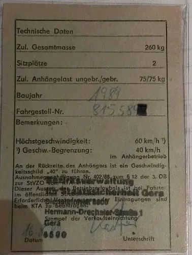 Auslieferung war der 20.1.92 in Suhl und läuft unter „Simson Fahrzeug GmbH Suhl“