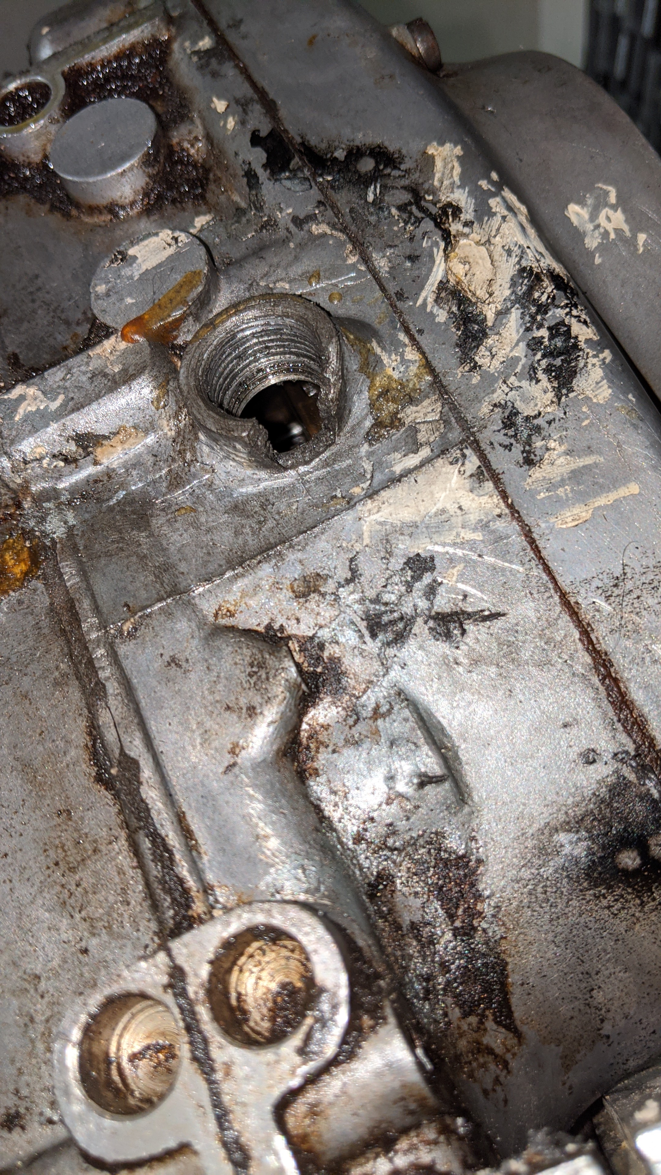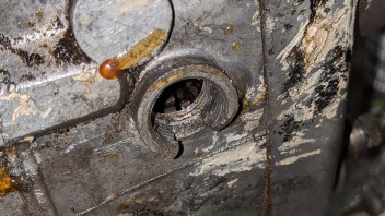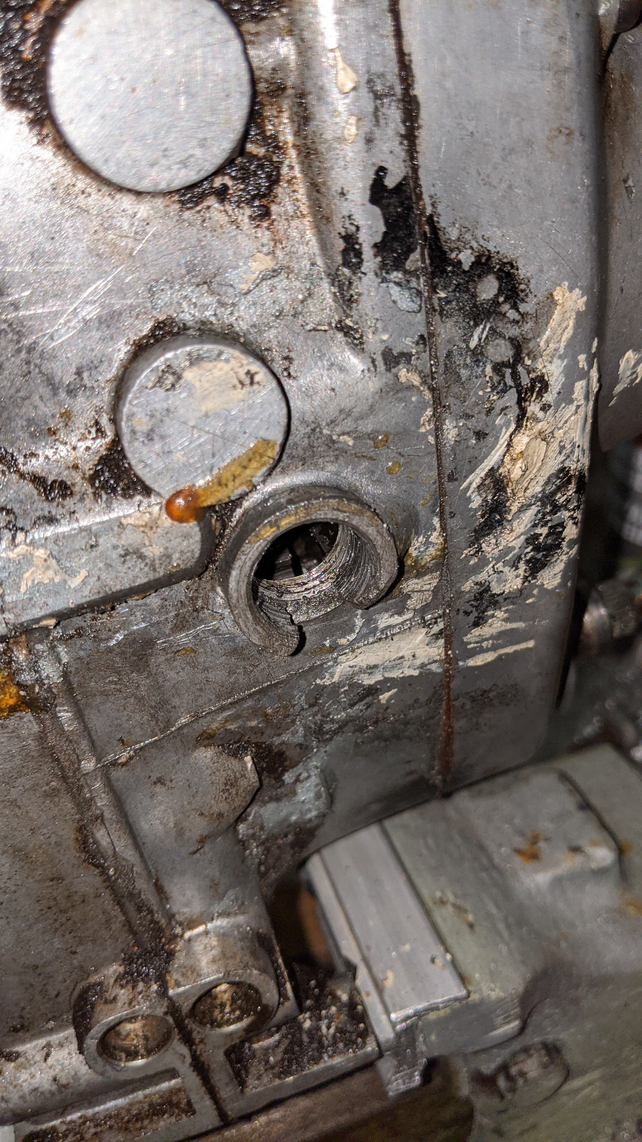 Das ganze Gefriemel mit zwei Komponenten Kleber / Flüssigmetall und eingeklebten Adapterstück mit M8 Ölablassschraube hatte ich um die Jahrtausendwende schon durch, als das Stück raus gebrochen war. Die Überreste hatte ich vorm Foto gerade entfernt