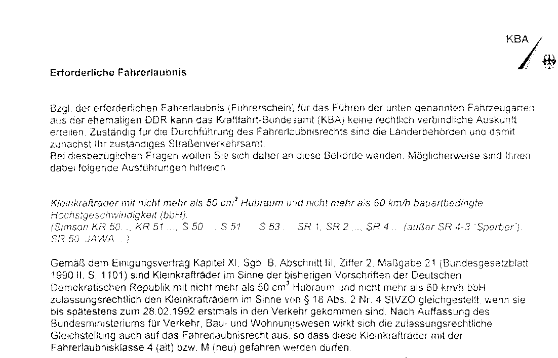 Er überprüft die Betriebserlaubnis und liest sich in aller ruhe die Kopie von dem Einigungsvertrag den ich zum Glück beigelegt hatte: „Gemäß dem Einigungsvertrag Kapitel sowieso sind Kleinkrafträder im Sinne der bisherigen Vorschriften der Deutschen Demokratischen Republik nicht mehr als 50 cm³ Hubraum und nicht mehr als 60 km/h bbH zulassungsrechtlich den Kleinkrafträdern im Sinne von § sowieso gleichgestellt...“