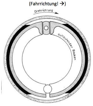 4. Der Backen, der von der achsenferne Seite vom Nocken betrieben wird, ist so was wie 3:1 effektiver beim Bremsen.