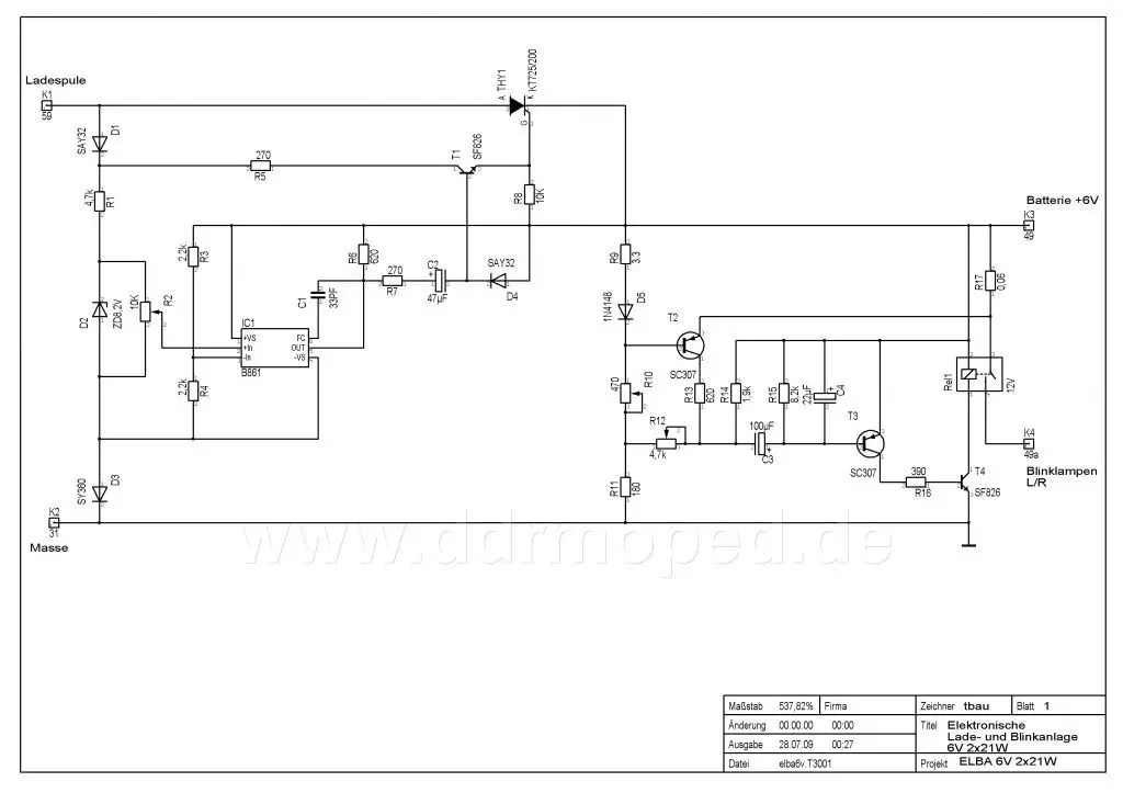 Anbei mal der Plan für 6V udn 12V verlinkt. Sie sind nur auf den ersten Blick unterschiedlich. Mit der Ausnahme dass bei 12V anscheinend ein IC für die Zeitverzögerung der Blinker verwendet wird.