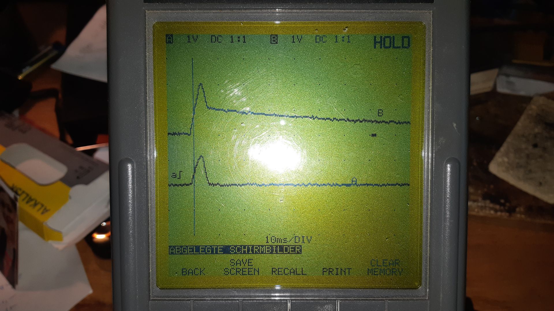 dieses bild hier zeigt die grundlegendende funktion der filterung von meiner schaltung: oben (B) die geberspannung gegen masse (hinter der diode vom geber-eingang, deswegen ohne negative anteile). unten (A) der verlauf zwischen masse und dem punkt, wo das gate des thyristors sitzt. die spitze im oberen verlauf ist derselbe spannungshub, der am gate des thyristors zur verfügung steht