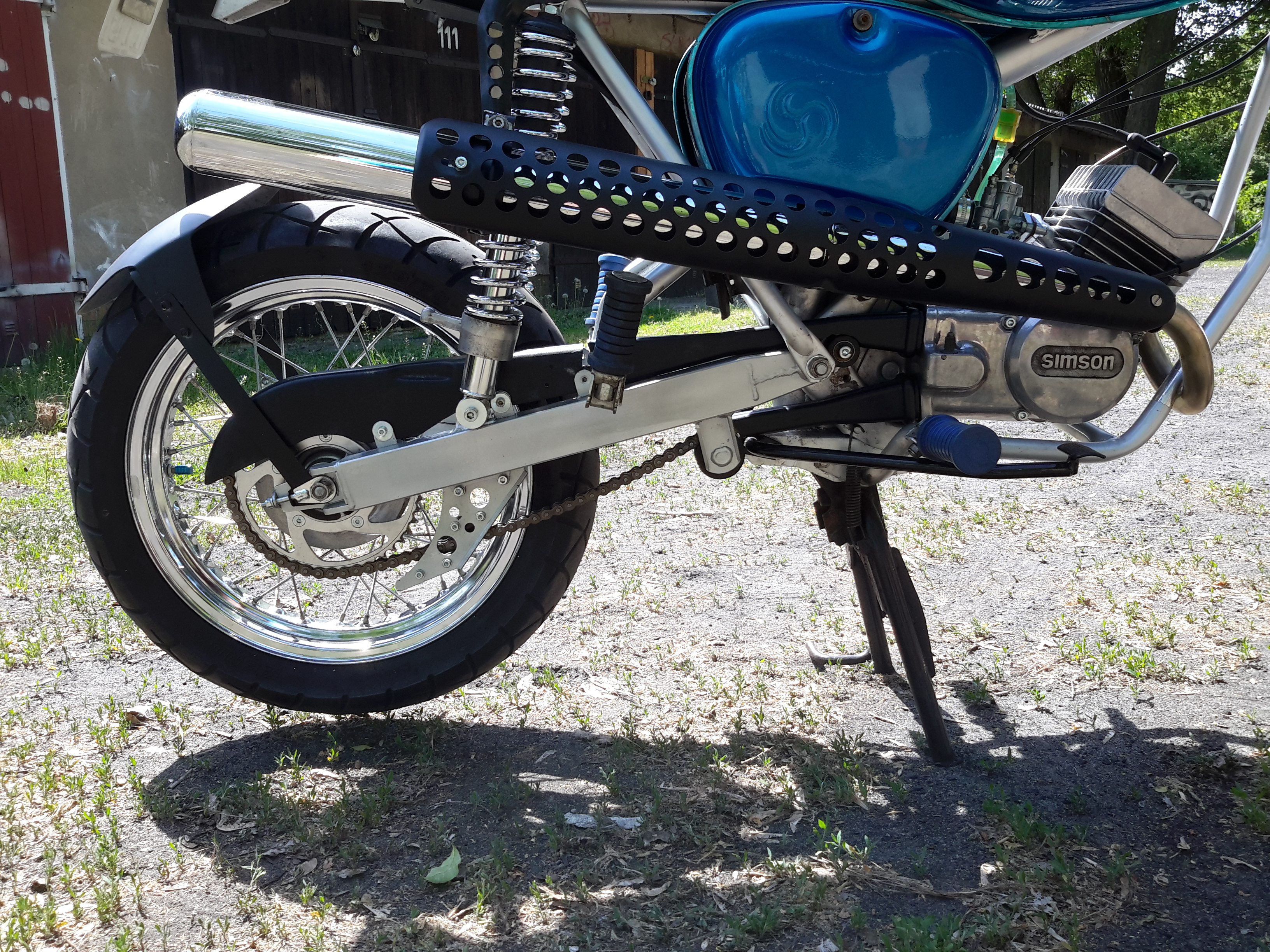 Alternativ mal bei den S53 Mofa und MS50 Modellen schaun, wie es dort gelöst wurde. Da gibt es speziele kuze Kettenschläuche und eine Kunststoff Abdeckung.